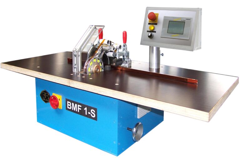 Die Bandagiermaschine BMF 1-S ist zur Bandagierung von Formstäben konzipiert. Der Bandagierkopf wird von einer Wickelkopfplatte getragen, welche auf einem Unterbau montiert ist. Die angetriebenen Vorschubrollen unterstützen die Führung der Formspulen. Durch diese Vorschubunterstützung wird manuell eine genaue Überlappung erreicht. Der Bandagierkopf ermöglicht ein schnelles Wechseln der Bandrollen und ist in offener Bauweise ausgeführt. Der Formstab läuft mittels zweier Stützwalze automatisch die programmierten Bandagierrichtungen ab. Der Antrieb des Bandagierkopfes erfolgt über einen Drehstrommotor. Durch die elektronische Drehzahlregulierung und Drehrichtungsumkehr kann der Bandagiervorgang den Arbeitsbedingungen (beispielsweise für konische Bandagenansätze und –ausläufe) optimal angepasst werden. Die Tischfläche ist gleichzeitig die Wickelebene für die Formspulen