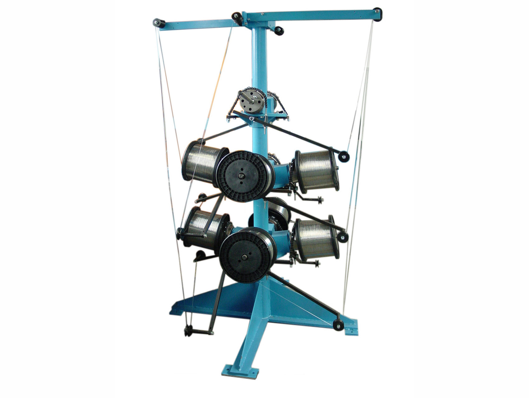 Der Drahtablauf APS 12 dient der störungsfreien Zuführung des Drahtes zur Maschine. Hierzu verfügen Sie über ein Bremssystem und einen Tänzer zur Zugspannungsregelung. Es können bis zu 12 Spulen verarbeitet werden.
