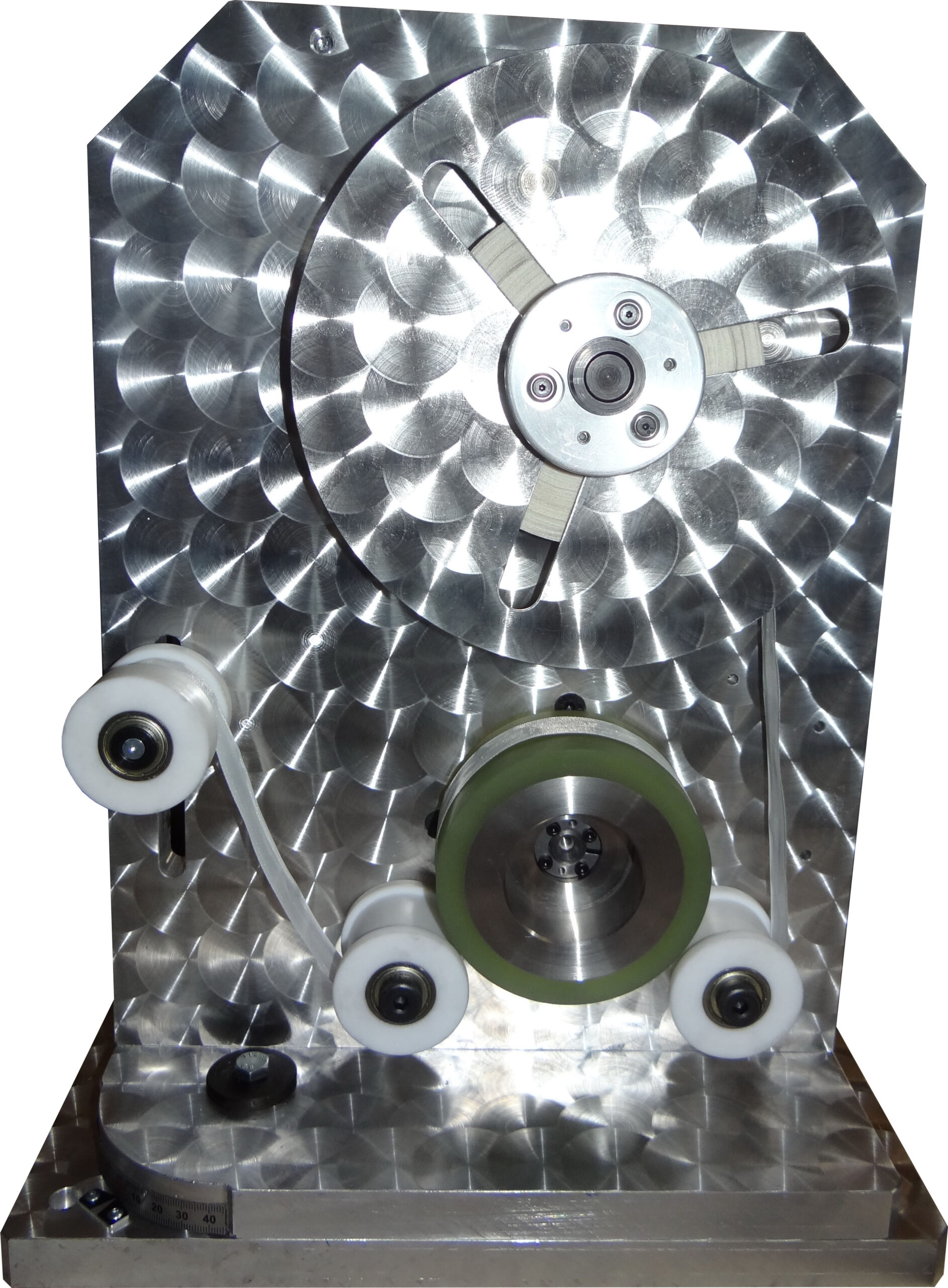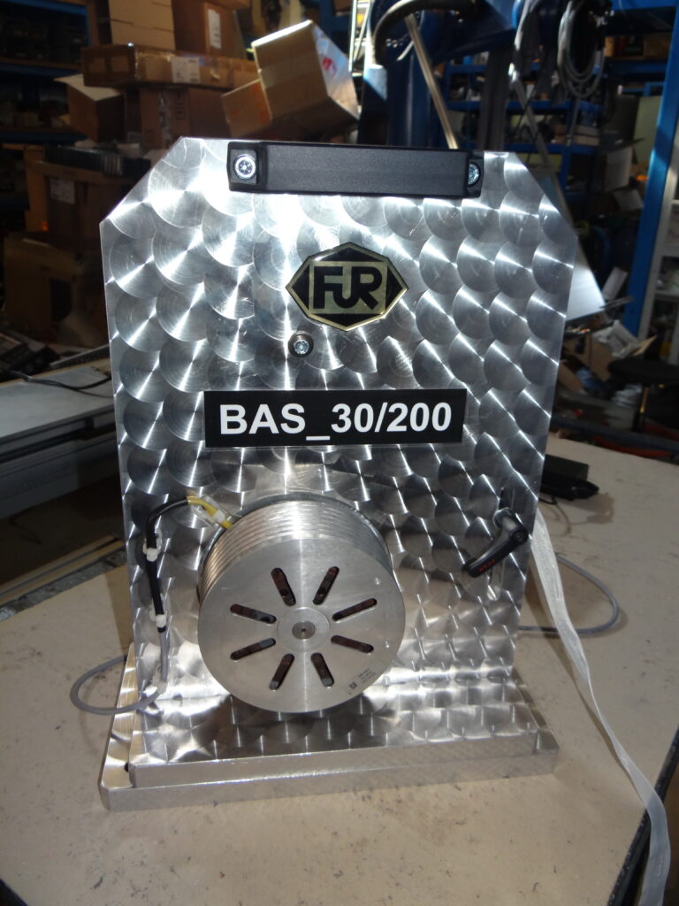Bandablaufsystem als separate Einheit zur Integration in eine bestehende Anlage. Um einen gleichmäßigen Bandabzug zu gewährleisten ist das BAS_30/200 mit einer Hysteresebremse ausgestattet. Die Bandabzugskraft ist dabei durch ein in die Steuerbox integriertes Potentiometer einstellbar. Zudem ist die Trägerplatte manuell schwenkbar und ermöglicht so das Einpassen des Bandeinlaufwinkels zum Wickelkörper.
