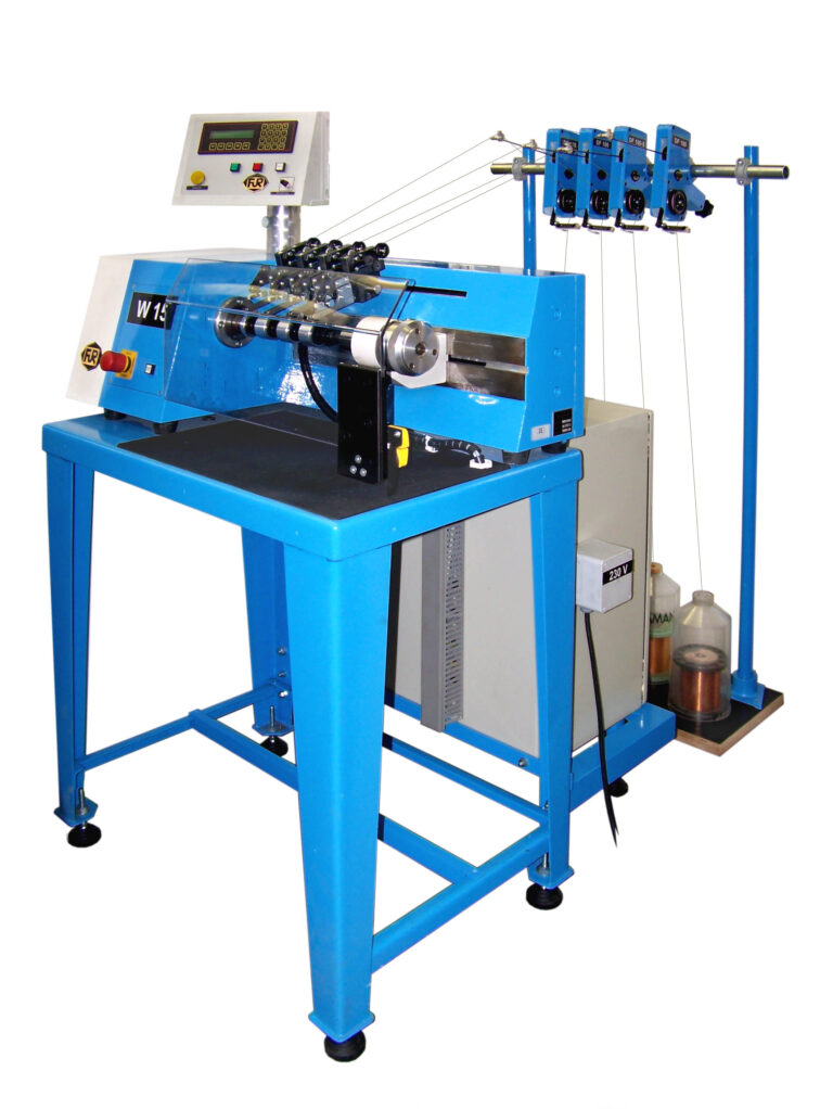 The W 15 is a compact special high speed layer winding machine with servo-controlled precision guidance. It has a fast action safety tensioner at the tailstock. This machine is suitable for single as well as multiple winding of relay coils, small layer coils, small transformers, transistor output connectors, baking- and air coils and so on, with high winding speed. An extremely economical production is guaranteed, due to a high maximum speed, simple handling, wire break control and the automatic winding process. The different operational modes are controlled with a PLC. In order to achieve a simplified and clearer operation of programming, the control desk is equipped with a Touch screen display.
