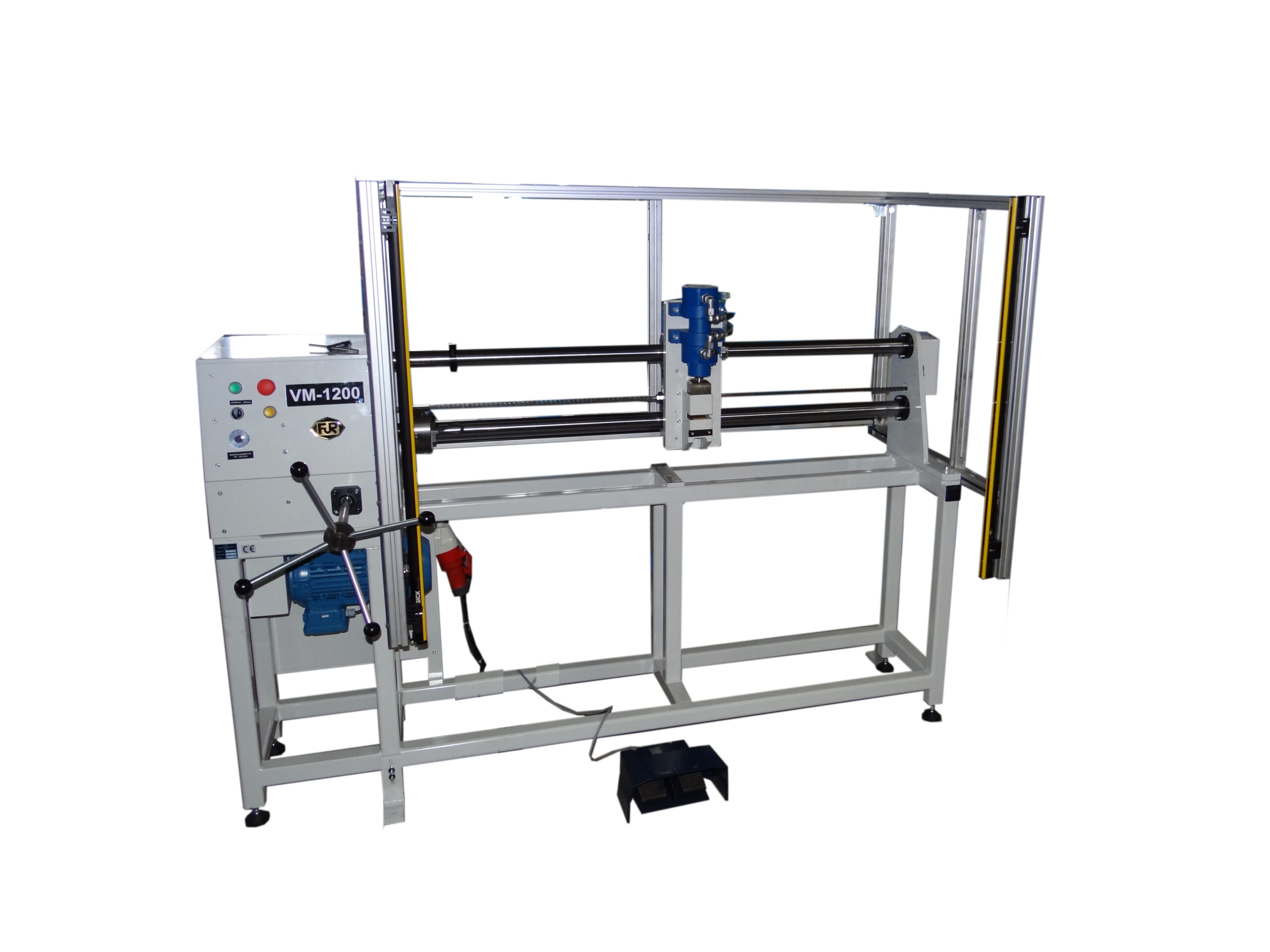 Mit der Verdrillmaschine VM-1200 werden Drahtschlaufen mit einer max. Länge von 1200 mm maschinell verdrillt. Um ein sicheres Halten der Drahtenden zu gewährleisten, werden diese hydraulisch geklemmt. Der Klemmdruck ist am mitgelieferten Hydraulikaggregat einstellbar. Das Lösen/Spannen wird mittels Fußpedal ausgelöst. Die Positionierung der linear verfahrbaren Drahtklemme erfolgt manuell mithilfe einer Kettenwinde. Zum Einstellen der Spindeldrehzahl dient ein Potentiometer.