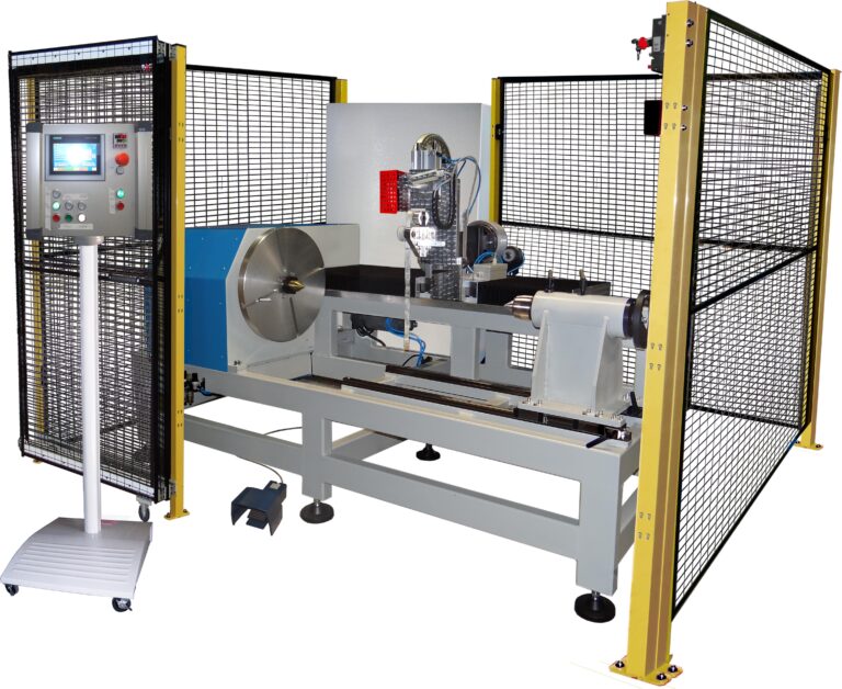 Die Rotorbandagiermaschine BM-Läufer ist eine sehr stabile, universell einsetzbare Maschine zum Bewickeln von großen Rotoren mit Polyesterglasfaserband mit sehr hoher Zugspannung bzw. Baumwollbändern.