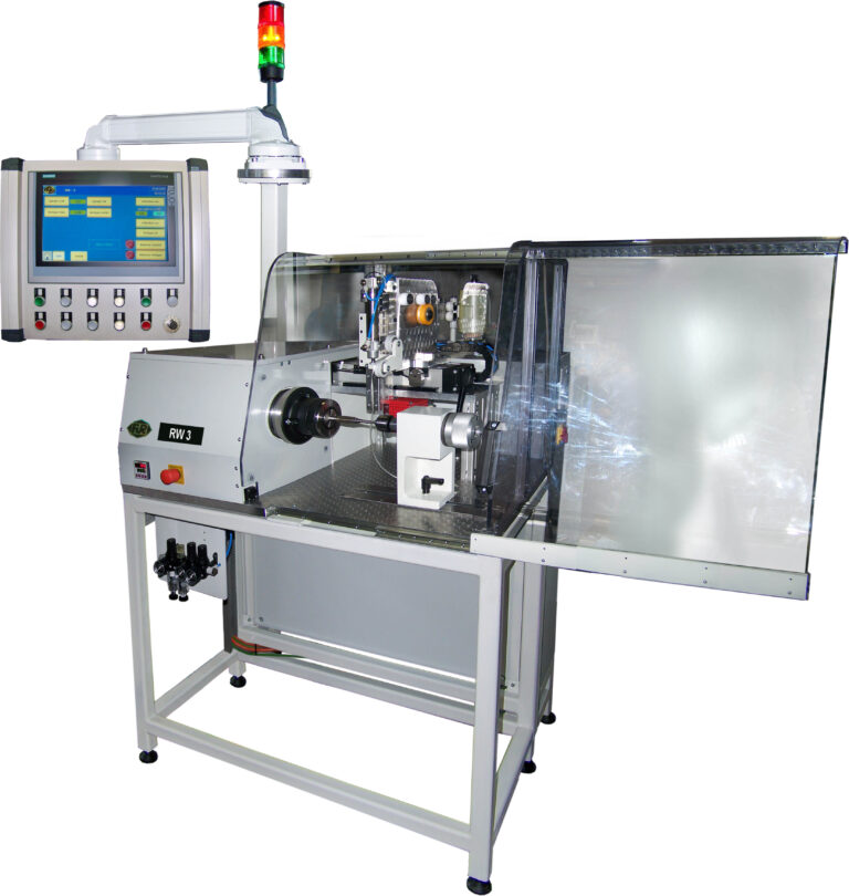 Die Rotorwickelmaschine RW3 ist eine äußerst stabile, universell einsetzbare Maschine zum Bewickeln von Rotoren mit Polyesterfaserband bzw. Baumwollbändern unter sehr hoher Vorspannung.