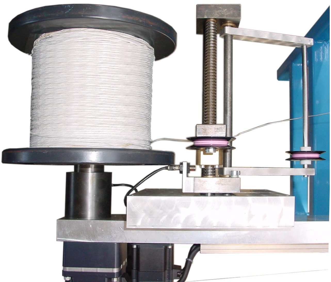 Mit dieser Maschine können bis zu 2 sehr feine Drähte in sehr hoher Geschwindigkeit auf ein durchlaufendes Trägermaterial bis max. 10 mm gebracht werden.